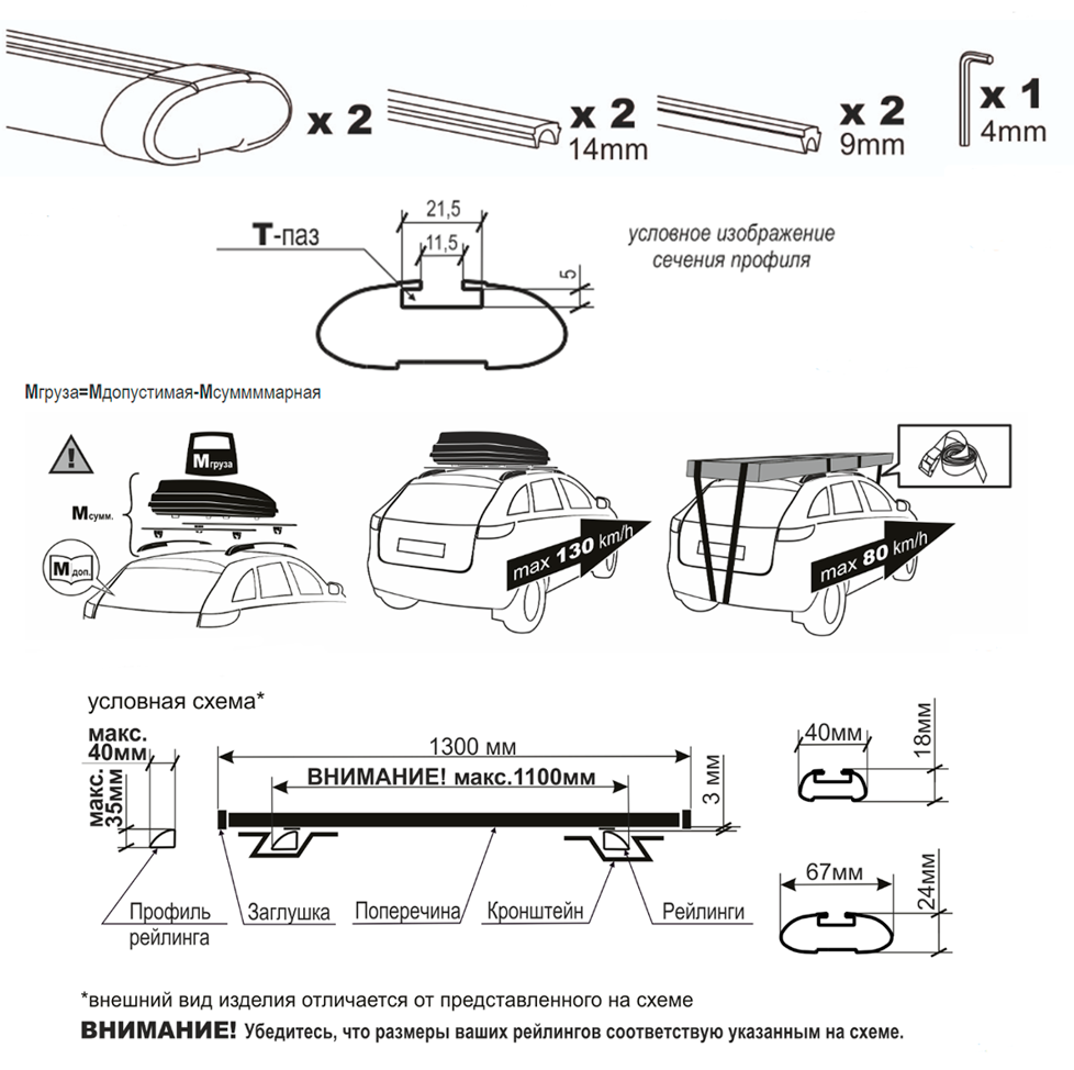 - Крепление осуществляется в обхват профиля рейлинга. Для осуществления компетентного выбора, необходимо убедится в соответствии конструкций Багажника и рейлингов Вашего автомобиля: крепление багажника подходит для профилей которые имеют размеры по высоте не более 35мм, по ширине не более 40мм. Расстояние между профилями рейлингов по их внешним сторонам должно быть не более 1100мм