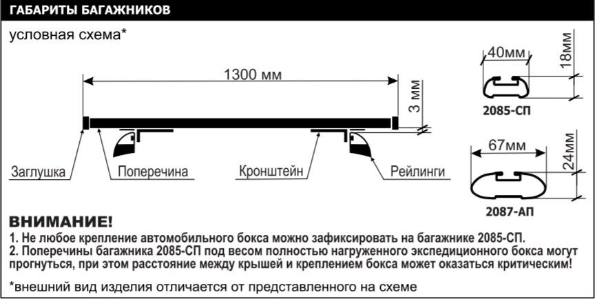 2. Поперечины багажника 2085-СП под весом полностью нагруженного экспедиционного бокса могут прогнуться, при этом расстояние между крышей и креплением бокса может оказаться критическим!