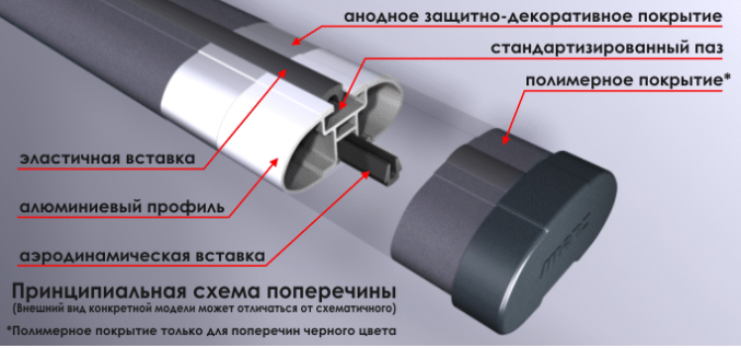 Оригинальный дизайн.Материалы и комплектующие высокого качества – упрочненный алюминиевый профиль с анодным покрытием, эластичный резиновый профиль, резиновые вставки, алюминиевые кронштейны.