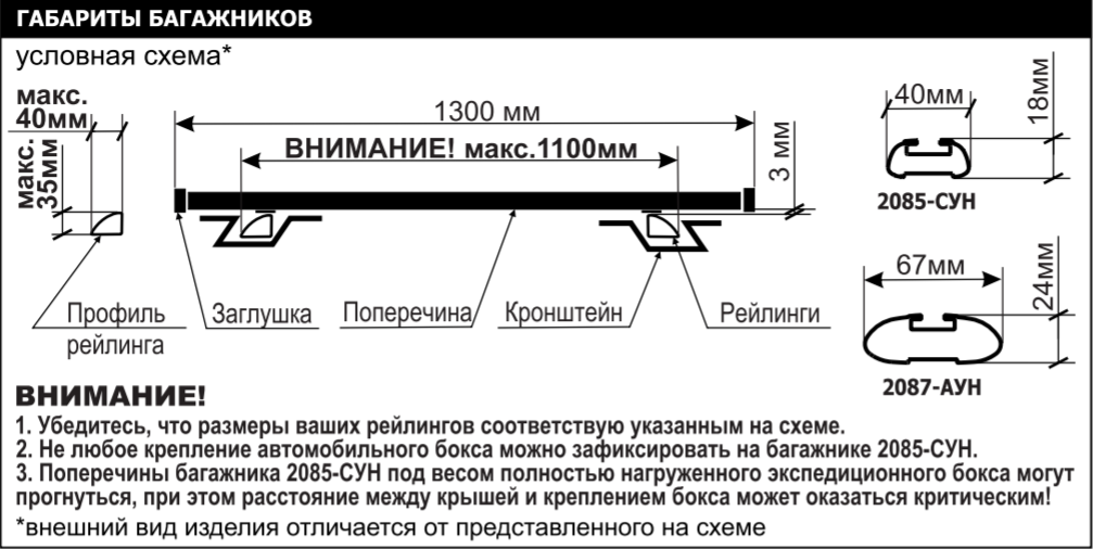 Для осуществления компетентного выбора, необходимо убедится в соответствии конструкций Багажника и рейлингов Вашего автомобиля.