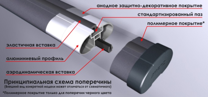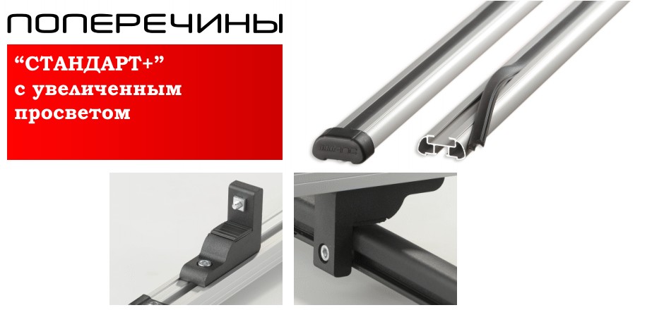 Поперечины багажника имеют обтекаемую форму, позволяющую уменьшить сопротивление потока воздуха при движении автомобиля. Имеют стандартизированный паз под установку дополнительных аксессуаров для багажников: крепление лыж, велосипедов, корзин, и прочего с соответствующим типом крепления. Наличие антифрикционной вставки сверху профиля поперечин позволяет надежно закрепить груз и защитить от повреждений поверхность поперечин багажника. Вставка в нижний паз профиля предотвращает появление аэродинамических шумов.
