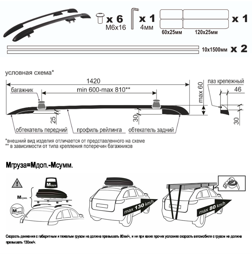 Конструкция рейлингов позволяет устанавливать багажники АПС (крепление "СКОБА") и других производителей в обхват алюминиевого профиля.